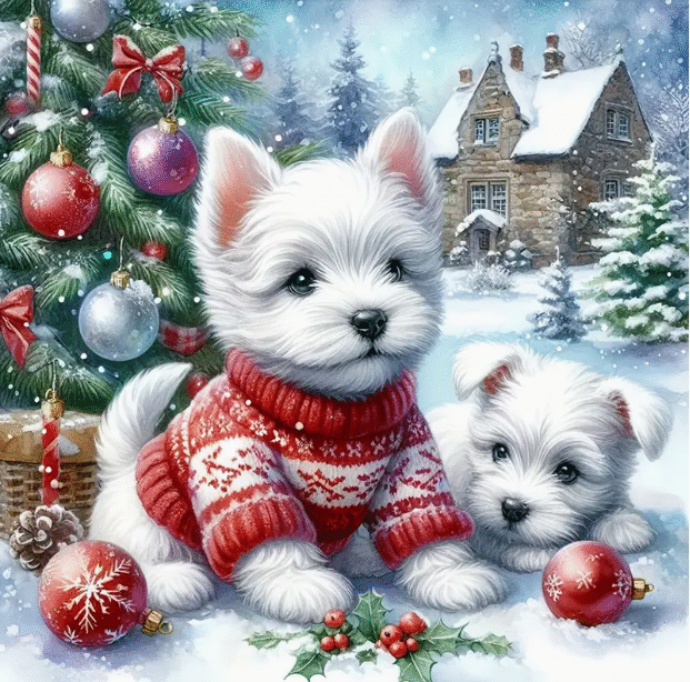 Diamantové malování s motivem pejsků s vánočními ozdobami