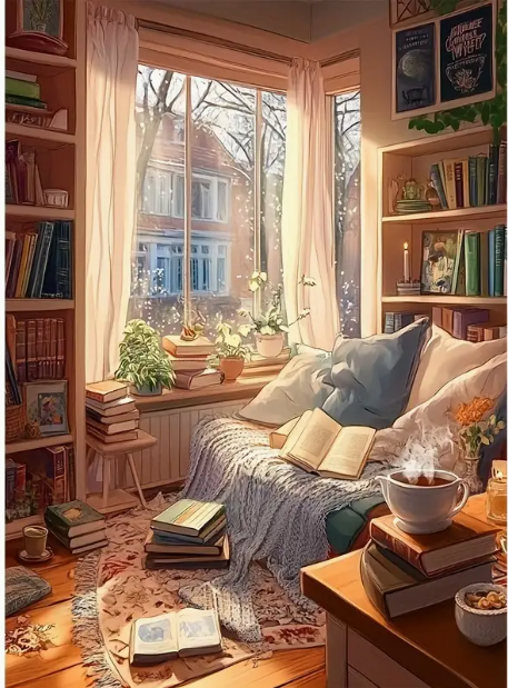 Diamantové malování s motivem zátiší s knihami