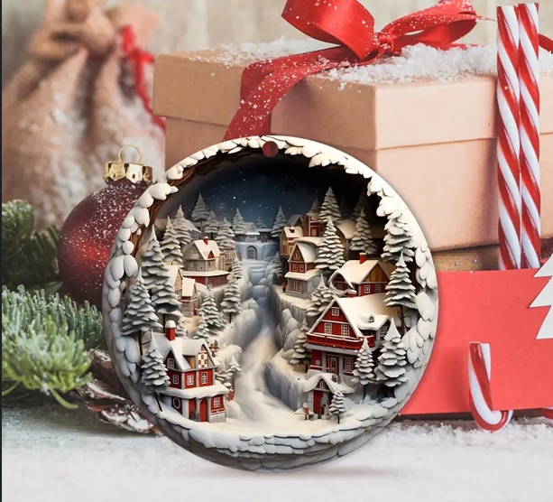 Dřevěná vánoční ozdoba s motivem vánoční vesnice vhodná k zavěšení do interiéru nebo na vánoční stromeček (není 3D)