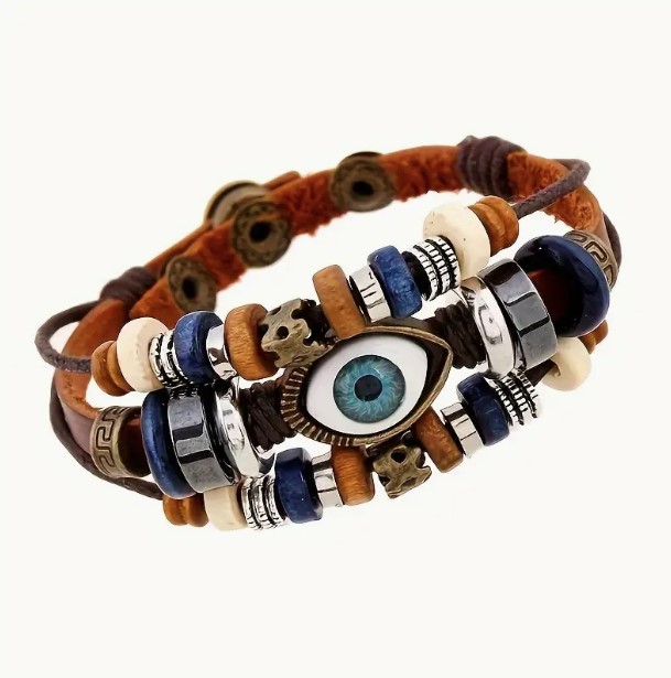 Unisex náramek z umělé kůže a korálky, kterým dominuje skleněné oko